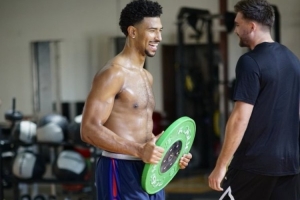 体育资讯8月9日讯 今天,受限制自由球员格莱姆斯在自己的推特上晒出了一张训练照。