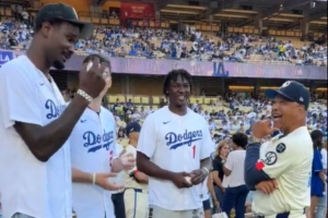 视频中,三人身穿美国职业棒球大联盟(MLB)球队洛杉矶道奇的球衣,来到道奇的主场参加活动。