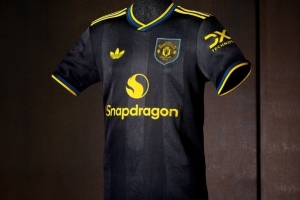 曼联新赛季二客球衣以黑色为主色调,点缀蓝色和黄色,阿迪达斯标志采用三叶草logo,设计灵感则是来源于上赛季90年代的曼联球衣。