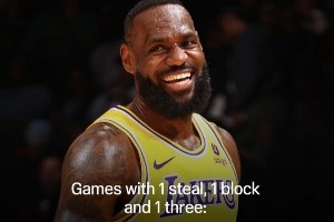 NBA历史上仅有三位球员至少有350场常规赛单场砍下至少1盖帽+1抢断+1三分,他们分别是:詹姆斯(464)、杜兰特(397)和哈登(361)。
