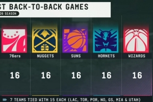 下赛季背靠背次数16次的球队:76人、掘金、太阳、黄蜂、奇才
