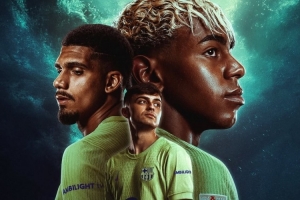 巴萨官方社媒发布了西甲首轮比赛海报,亚马尔、阿劳霍、佩德里出镜。