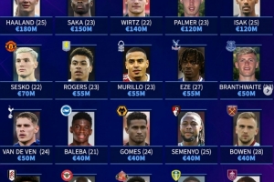 德转列英超20队身价最高球员:哈兰德领衔,萨卡、维尔茨在列