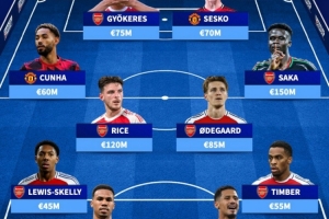 体育资讯8月17日讯 英超首轮焦点战阿森纳对阵曼联即将打响,德转盘点了两队球员身价最高阵容,具体如下: