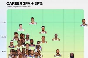 体育资讯8月21日讯 近日,数据媒体NBA University晒出一张NBA历史上三分出手次数排名前55名的球员生涯三分命中率统计图。