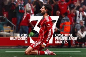利物浦官推也晒出索博滑跪庆祝照,并晒出最近37场英超对手的队徽,同时指出:“红军连续37场英超均能破门,这也是俱乐部的新纪录。”