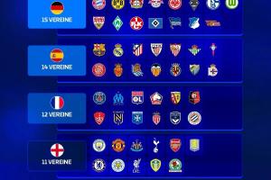 欧冠改制后五大联赛参赛排行:德甲15队居首,英超、意甲11队最少