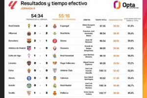 体育资讯10月21日讯 OPTA统计了西甲第九轮各场比赛的有效时间,没有任何一场比赛的有效时间超过60分钟。