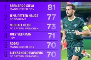 本赛季欧冠完成进攻三区传球榜:B席81次第一,曼城4人上榜