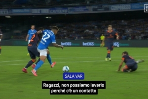 VAR: "确实,迪洛伦佐有介入,但他介入是因为一个动作……他并不是为了争取不属于球的空间而伸腿,而是为了保护球而伸腿。我们来看一下姆希塔良的动作,稍等。看看迪洛伦佐的脸,他正保护着球。稍等一下,我在核实。”
