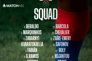 前锋:7-克瓦拉茨赫利亚、9-贡萨洛-拉莫斯、19-李刚仁、29-巴尔科拉、47-恩贾恩图、49-姆巴耶