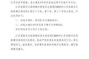 根据相关纪律准则,江苏联官方决定对连云港队、泰州队予以通报批评,对连云港队3号球员姜卫鹏予以停赛1场。